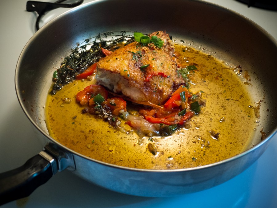 Bone-in chicken breast with garlic, shallot, red pepper, thyme, spring onion. Note phenolic handle on 10-inch Farberware sautee pan.